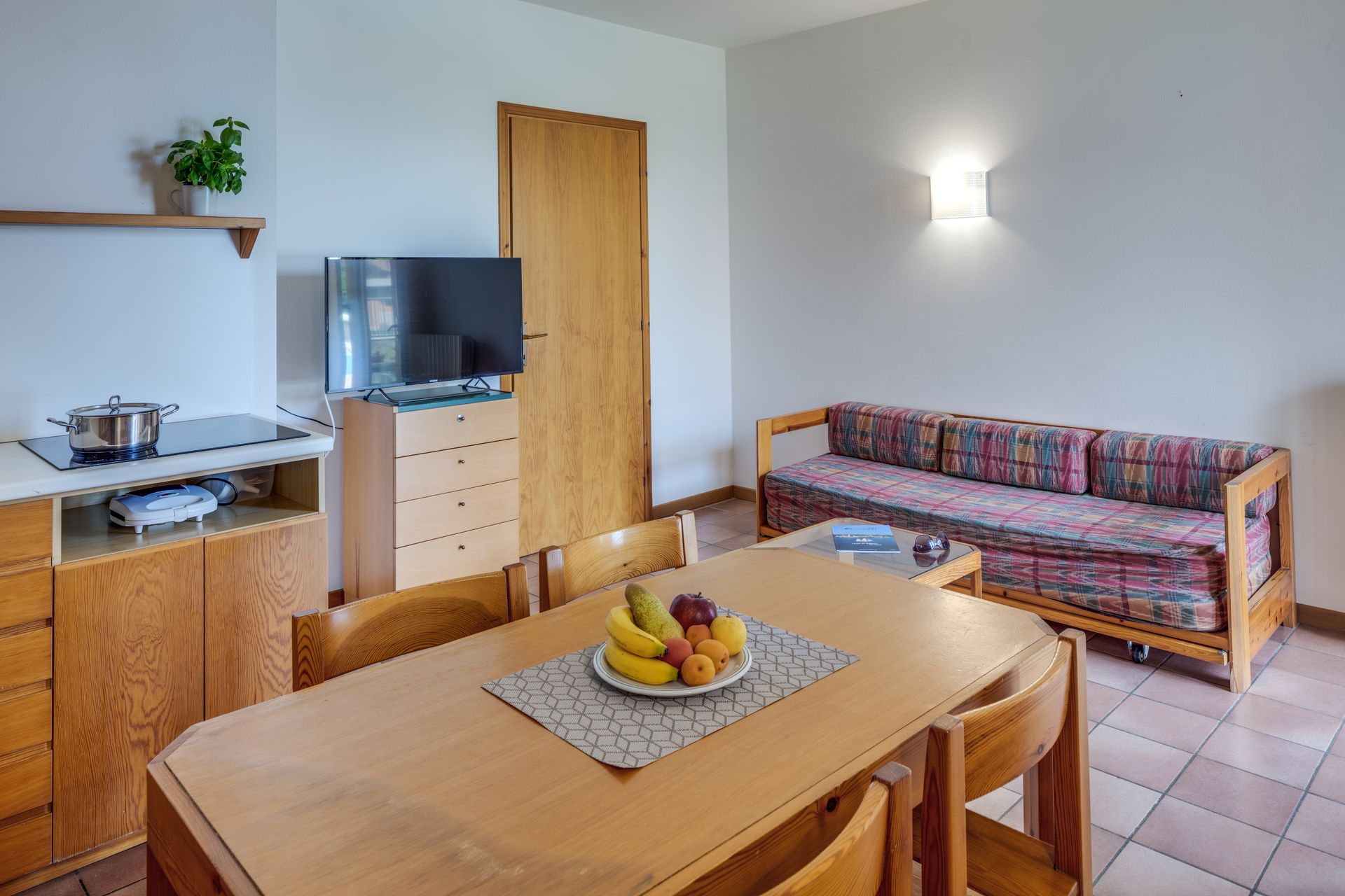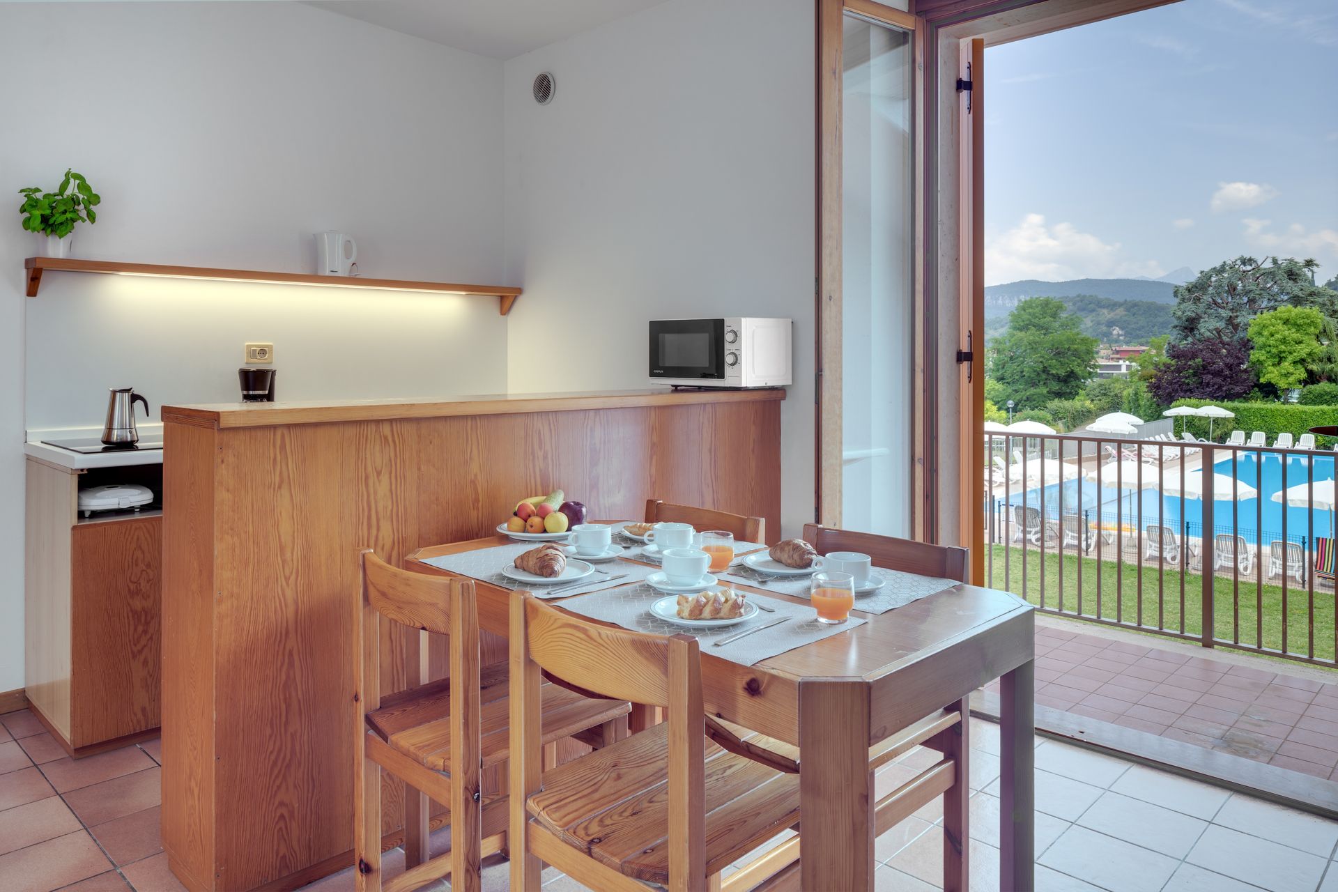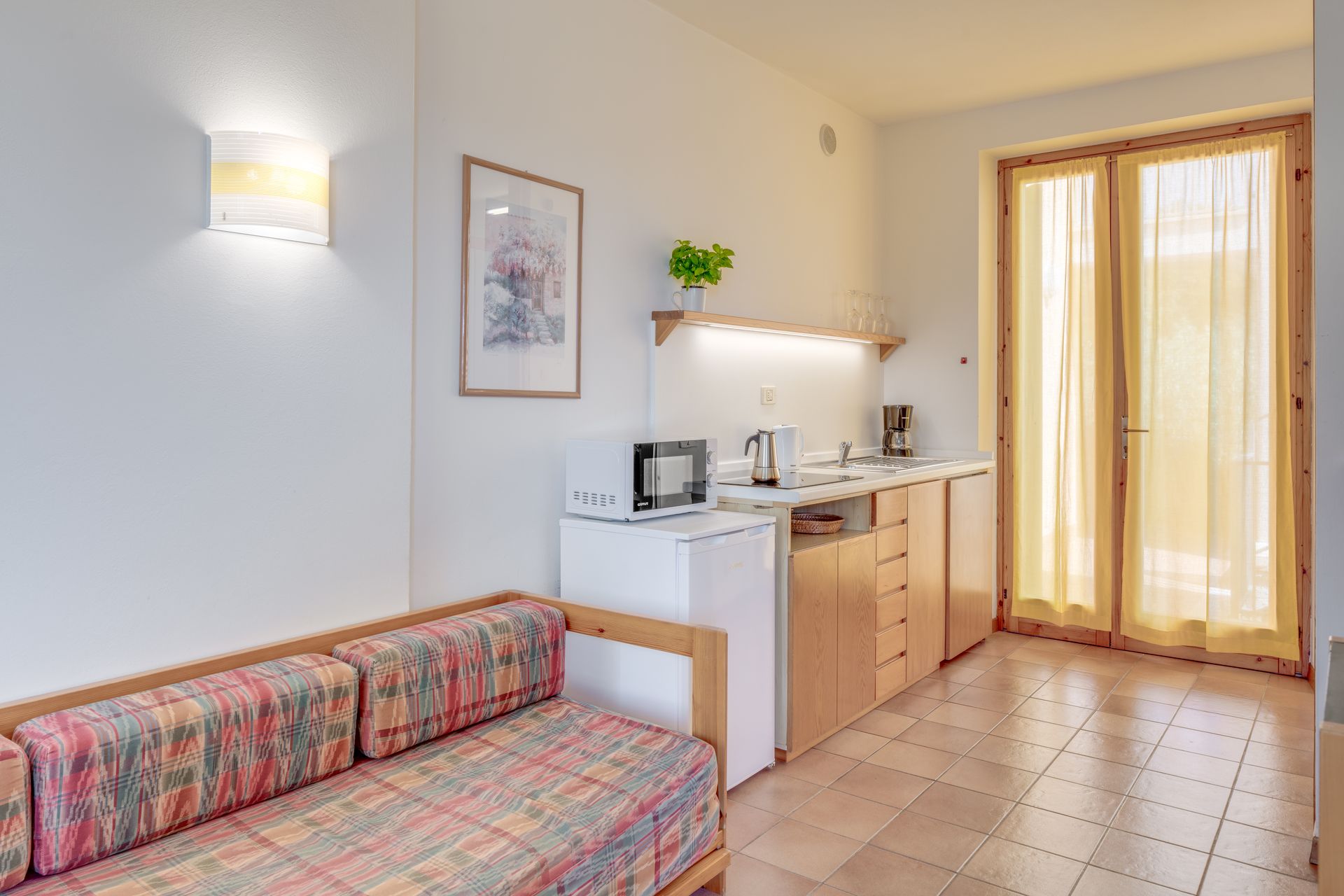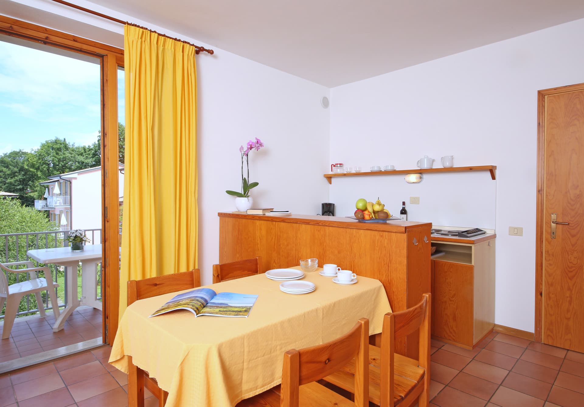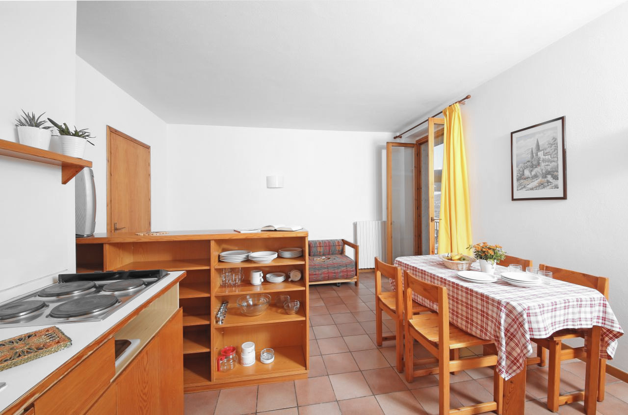 Surrounded by stunning scenery, our self-catering apartments are functionally furnished and equipped with air conditioning, a safe, satellite TV, and a kitchenette that includes a drip coffee maker and a moka pot. Each apartment also features a balcony or terrace furnished with a table and chairs.