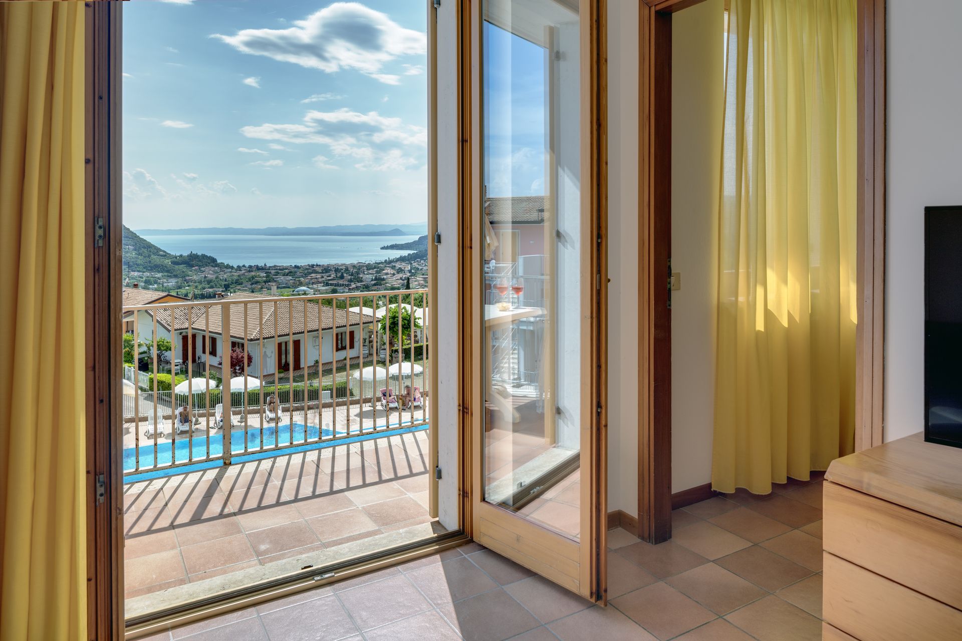 One-bedroom apartment: living room with double sofa bed and kitchenette, double bedroom, bathroom with shower. With lake-view balcony or terrace.